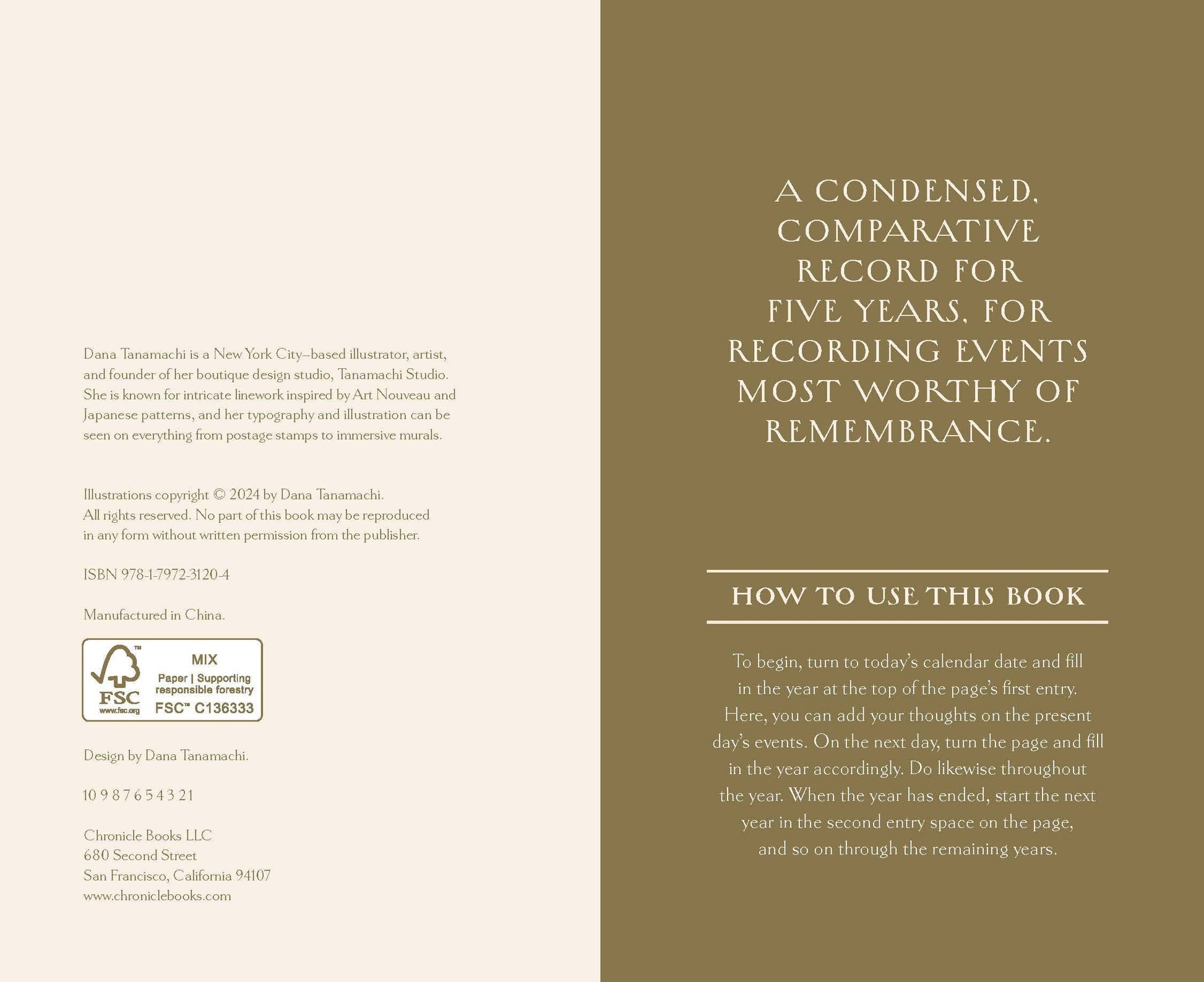 This keepsake memory book invites you to capture just a single quick line once a day over five years. As you write, the layout allows you to see your highlights and reflections on the same date in previous years.