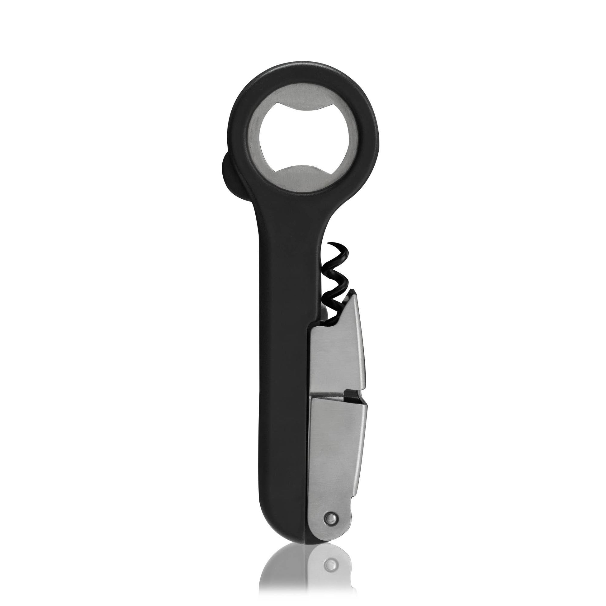 This compact yet powerful Professional Corkscrew is designed for both sommeliers and wine enthusiasts. Its double-hinged design provides two points of leverage for seamless uncorking, and the 5-turn, non-stick coated worm easily pulls both natural and synthetic corks. The corkscrew also includes a built-in 3-blade foil cutter and a bottle opener for added versatility. The magnetized body ensures convenient storage and access. Sleek, durable, and compact, this corkscrew is a must-have addition to any bar or kitchen.